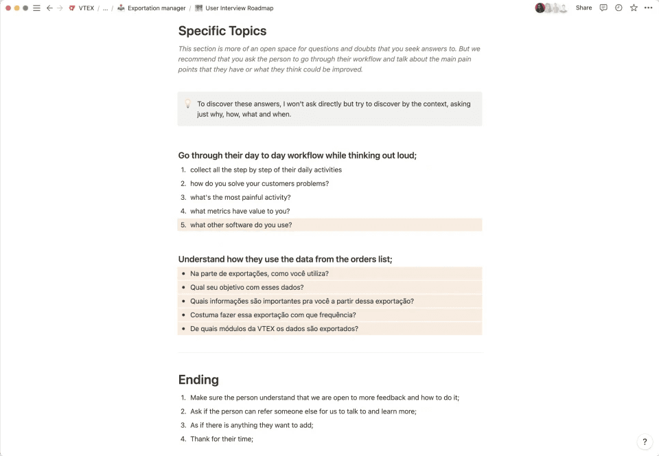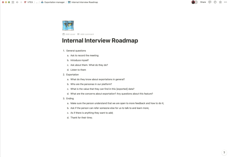 Para entender como funciona a plataforma da VTEX, além do motivo pela qual usuários utilizavam a exportação e também conhecer melhor o time, comecei por uma pesquisa interna entrevistando o time de Design.