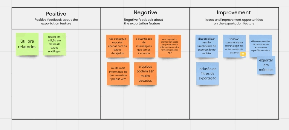 A partir disso, fiz uma matriz com todas as respostas de forma a condensar e entender quais eram as certezas, suposições e dúvidas que tínhamos a respeito do tema. Esse processo foi importante para que pudéssemos entrevistar usuários da plataforma para realmente entendermos o motivo do uso da planilha de exportação do Orders e como poderíamos melhorar essa experiência.